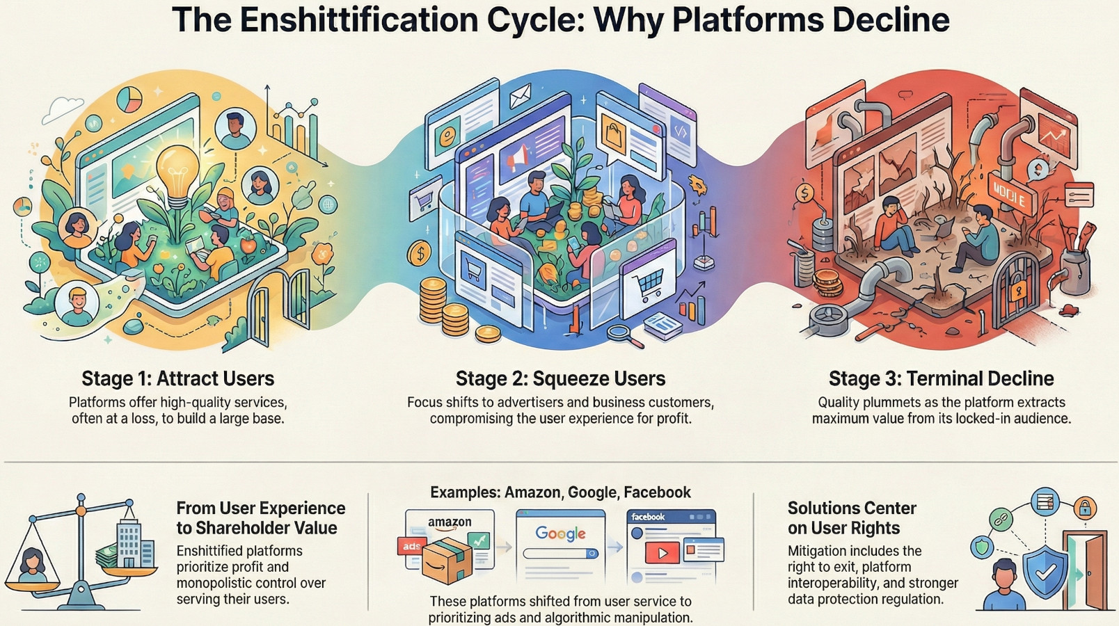 This three-stage cycle isn't inevitable—it's a product of a specific environment. When monopolistic control eliminates meaningful competition, platforms are emboldened to abuse users in stage two without fear of a mass exodus. This environment, characterized by a lack of interoperability and an increased reliance on advertising, creates the perfect conditions for the cycle to run its course. We see this playbook in action across the digital world, from Facebook's pivot to data collection and Google's degradation of search results to Amazon's prioritization of profits over customers.