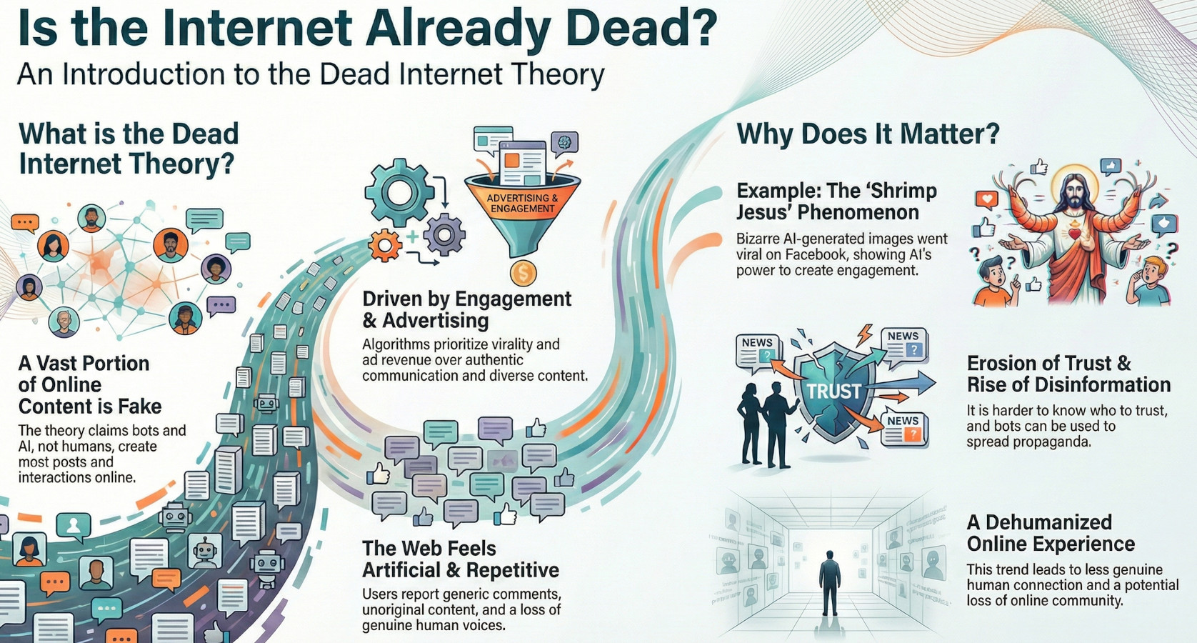 Whether the internet is technically "dead" or simply unwell, the Dead Internet Theory highlights a genuine and deeply concerning trend. Our online world is becoming increasingly artificial and less human, driven by algorithms and corporate agendas rather than authentic interaction. But the theory's most chilling implication may be its potential to become a self-fulfilling prophecy. As our online spaces feel more artificial and we become more skeptical, our own genuine participation may decline, leaving an even larger void for AI to fill.