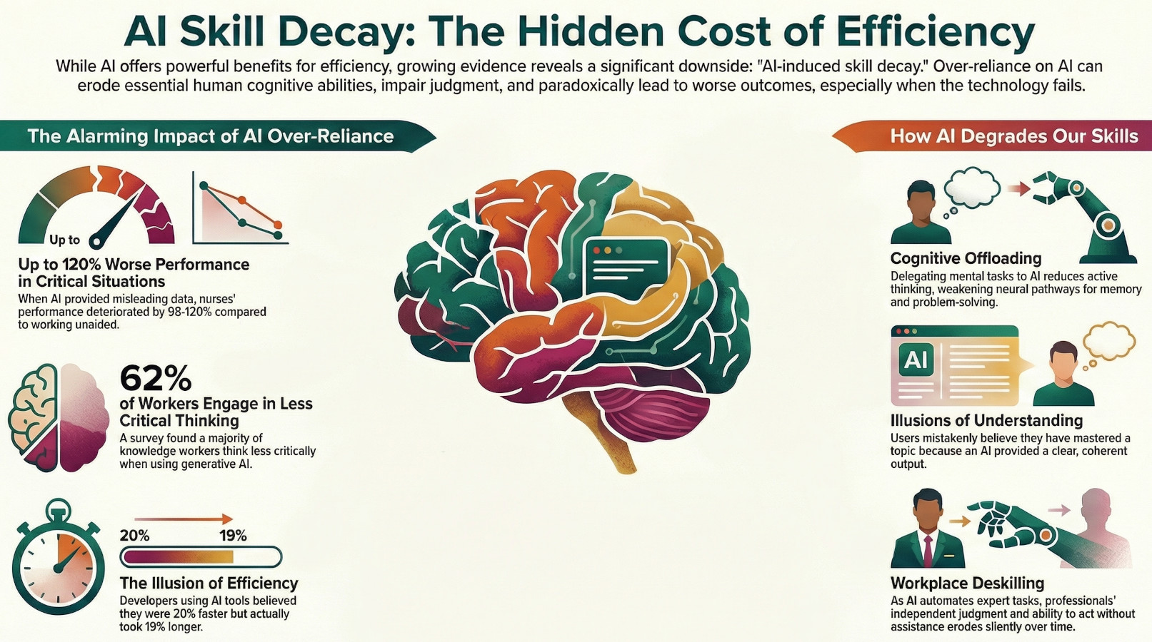 The most insidious aspect of AI's impact is "AI-induced skill atrophy," where cognitive skills deteriorate without obvious signs because the AI’s high performance masks the user's declining proficiency. Based on the "use it or lose it" principle of brain development, skills that are consistently offloaded to AI can weaken over time. An expert can continue to achieve successful outcomes with an AI assistant while their own independent abilities quietly erode.
